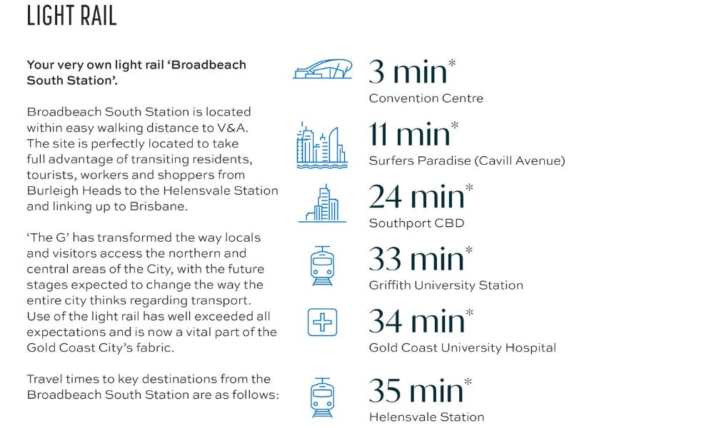Conveniently located only one kilometre from the Broadbeach South G-Link station. Offering terrific public transport access servicing patrons from Broadbeach to Helensvale train station. Stage 3 from Broadbeach to Burleigh Heads began construction in late 2021.